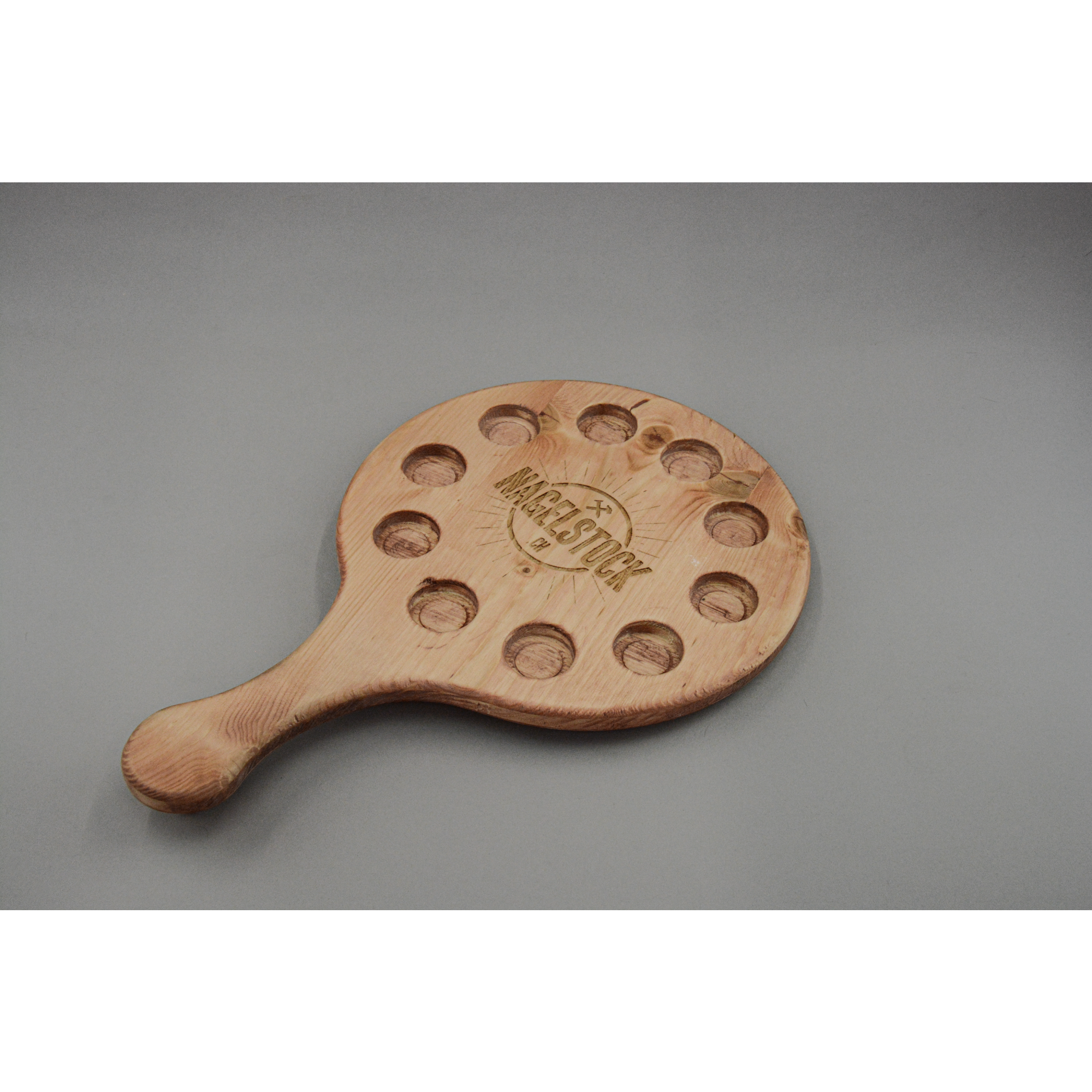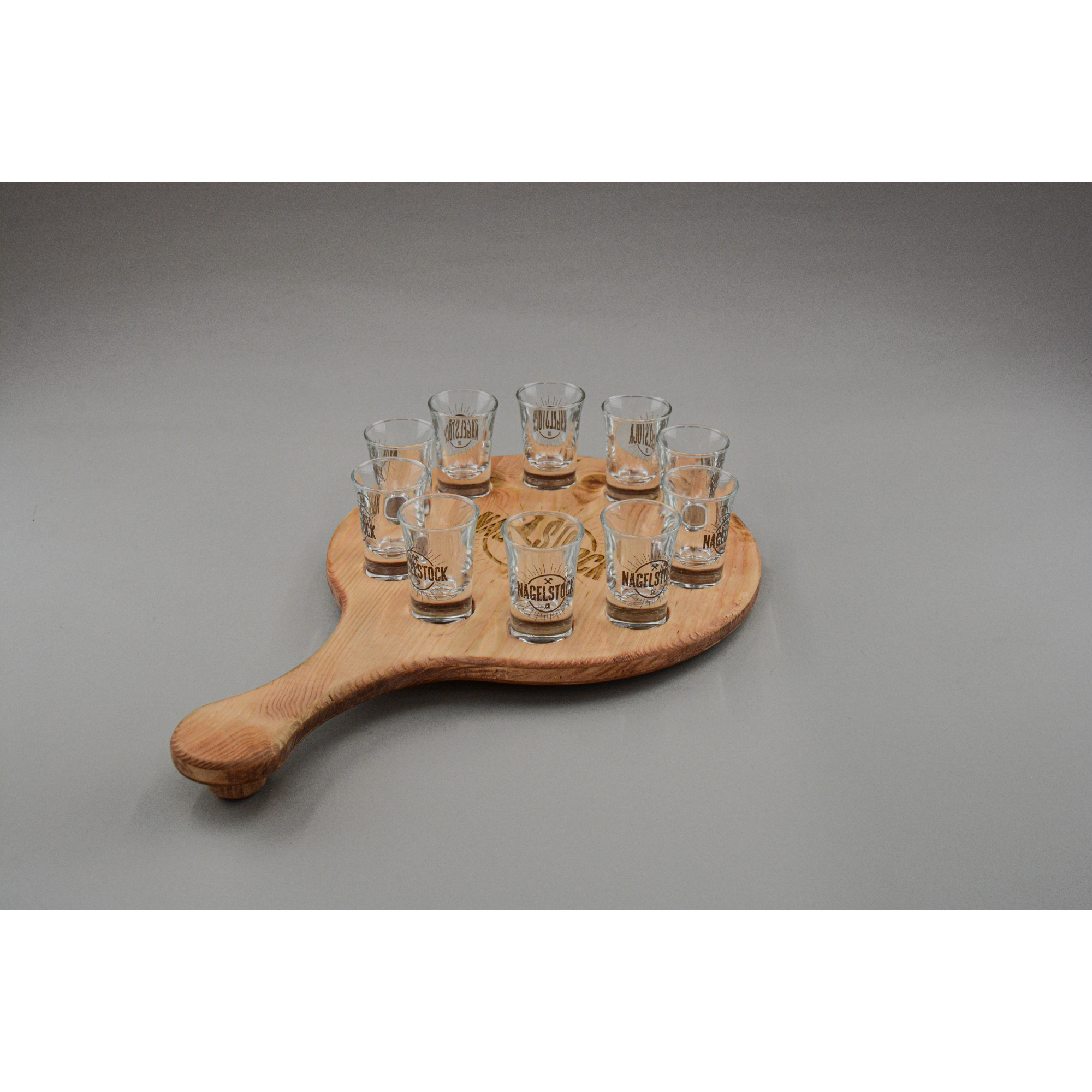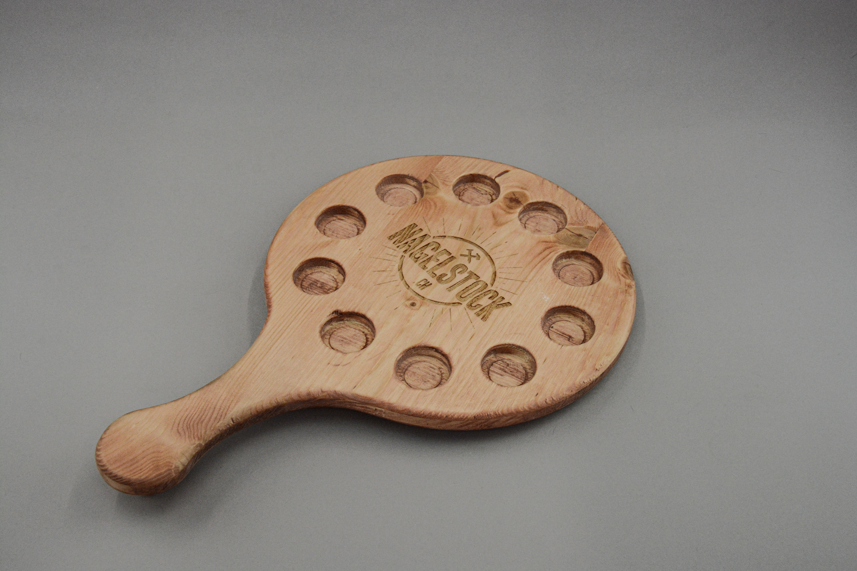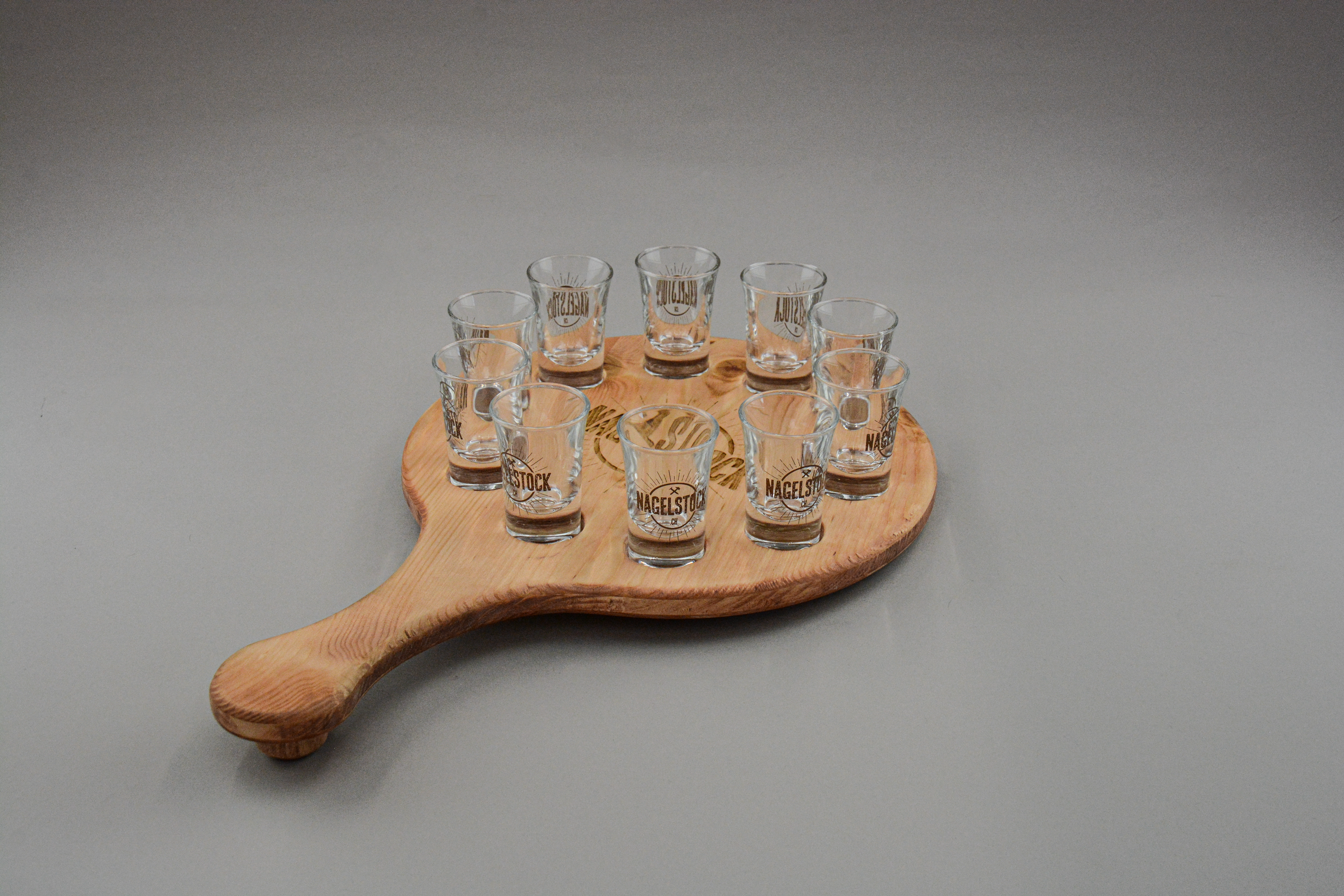 Auf unserem Shotbrett finden zehn Shotgläser Platz. Das Shotbrett verfügt am Griff über eine Halterung, mit welcher man es einfach am Stahlgestell seitlich befestigen resp. hinhängen kann.